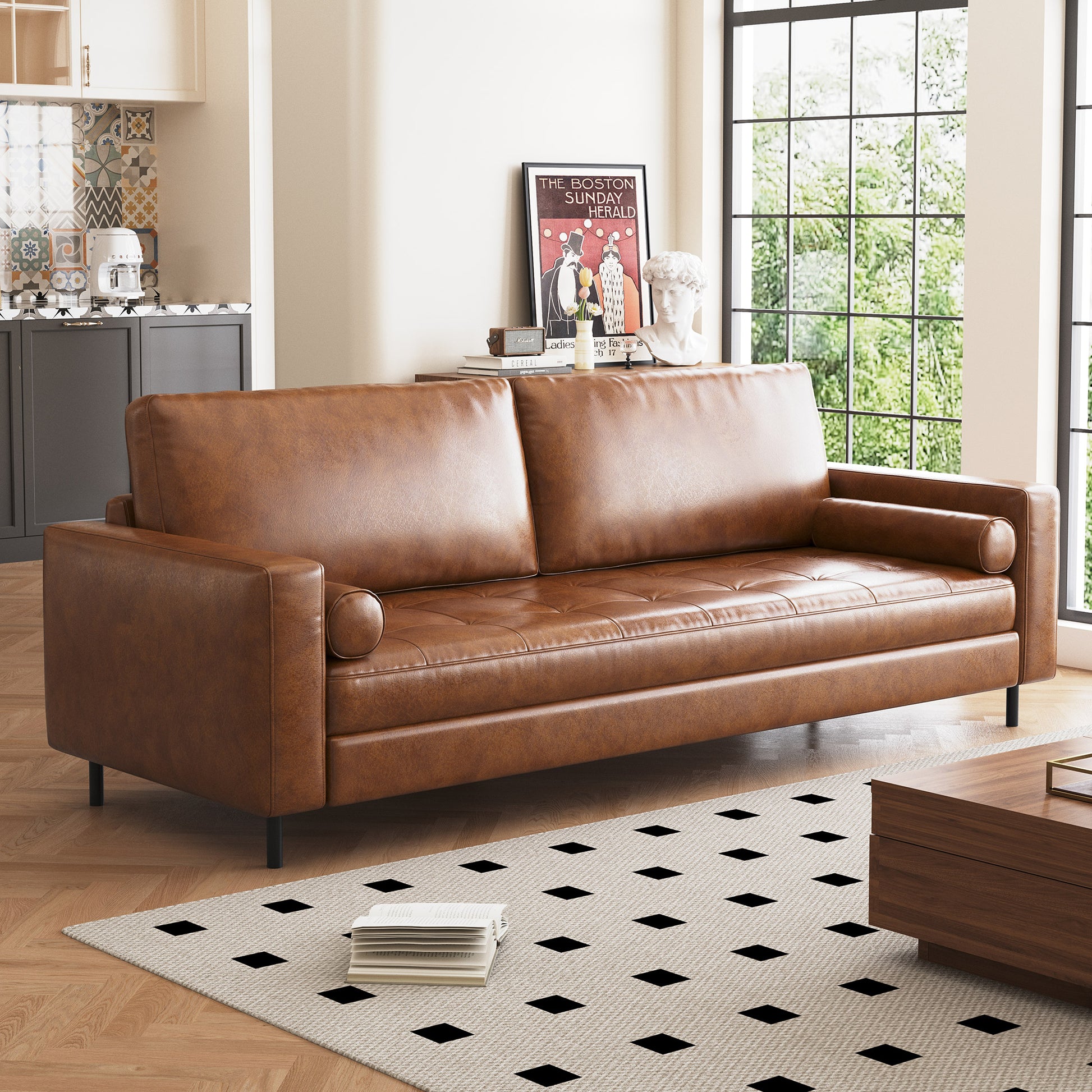 Add sophistication and comfort to your living room with this modern brown leather sofa. Measuring 31.49"D x 80.31"W x 33.85"H, it comfortably seats up to 3 people, making it perfect for family gatherings or entertaining guests. The soft, durable leather upholstery ensures long-lasting comfort, while the sleek design complements contemporary and minimalist decor. With its sturdy construction and supportive cushions, this sofa is the perfect addition to any modern home.