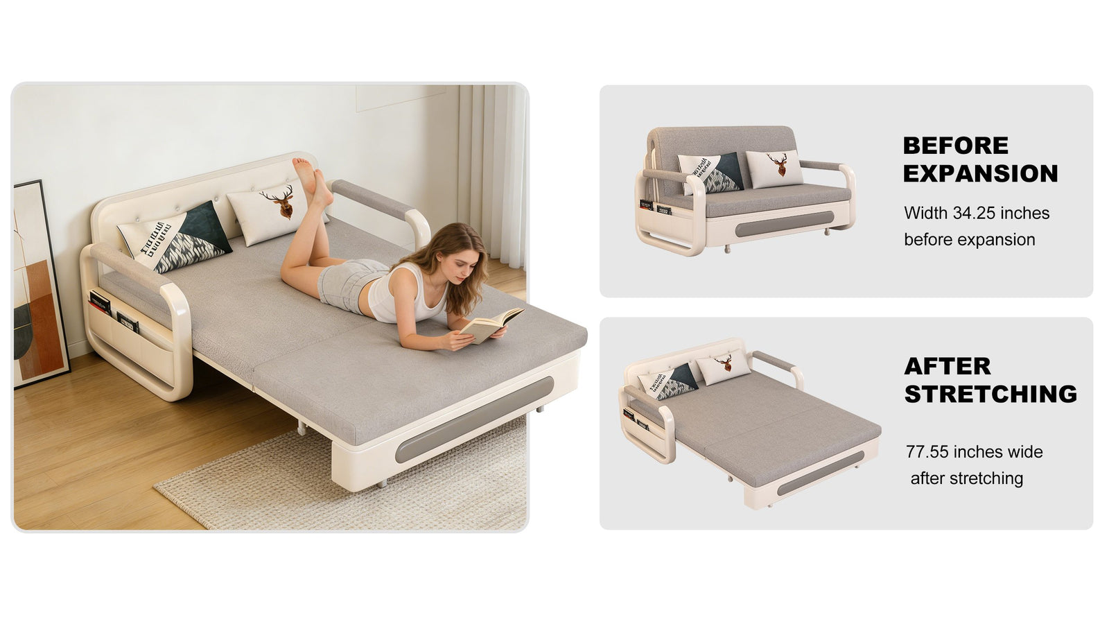 Equipped with high-density foam cushions, the sofa offers balanced support for both sitting and sleeping. Designed for everyday comfort.