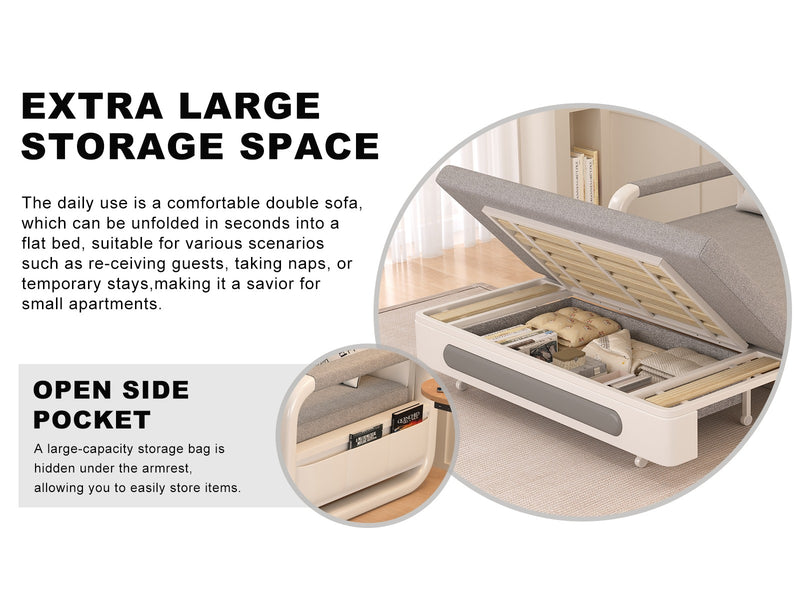 Includes a storage compartment under the seat for blankets or pillows, along with side pockets for organizing small items such as remotes or books.